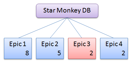 Now we know that 2 epic points are 20 story points; this means that the Star Monkey DB would take, roughly, 170 story points to build. If your team has a established velocity your done. If not you'll have to do a estimated velocity to find out how many iterations you think you need.